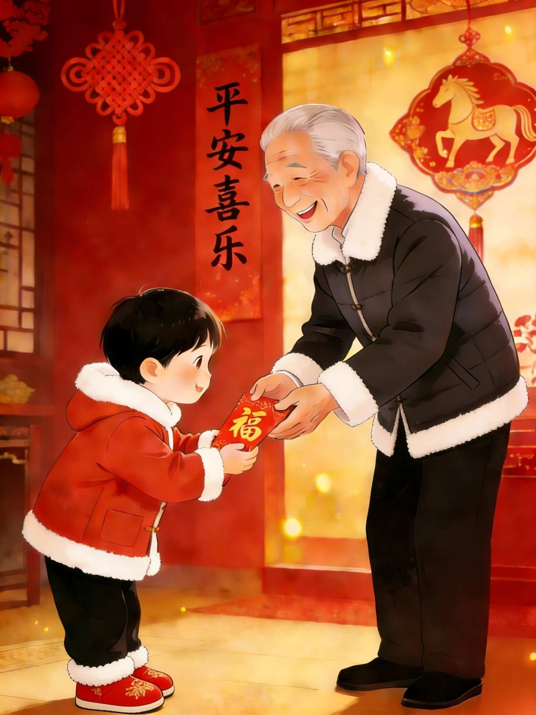 После вечере, најпопуларнији је обичај да деца добију срећу у црвеним ковертама од родитеља и бака, деда или других рођака.