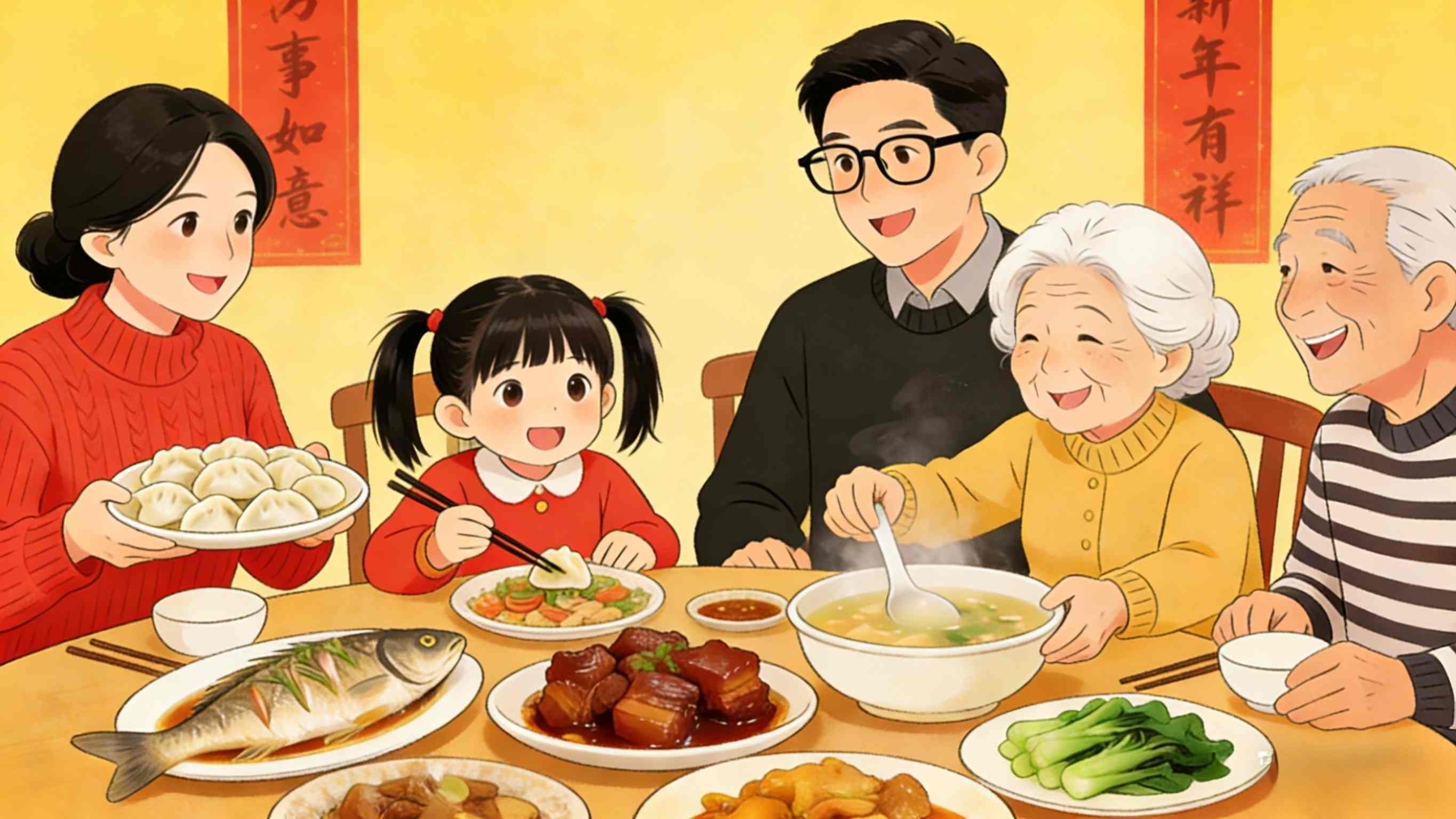 Увече 30. јануара, последњег дана године у кинеском календару, породице се окупљају на поновној вечери, деле топлину и радост у међусобном друштву.